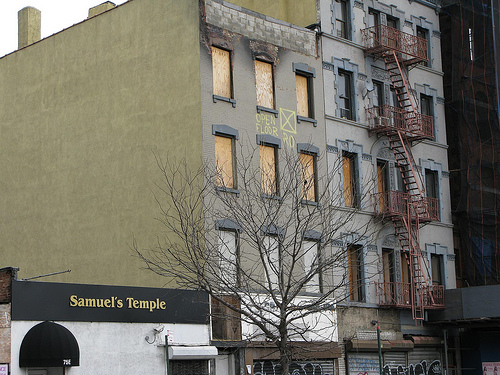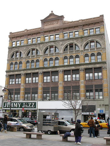 Does this seem “stultifyingly stupid” to you? Does it not take steps to provide affordable housing and to enhance the urban quality of the street while maintaining its historic character? If anything, it seems eminently reasonable to us, given that 125th Street is currently marked by 1) shitty — no, the shittiest possible — retail stores and fast-food restaurants, 2) abandoned property and storefronts, and 3) great swaths of post-war architecture with about as much interest as a New Jersey strip mall. (See pix below.) We would also like to note that the City has no plans to alter the few grand dames of 125th Street, namely “historic buildings such as the Apollo Theater, Theresa Towers and the Corn Exchange which are registered New York City Landmarks.” (More pix below.)