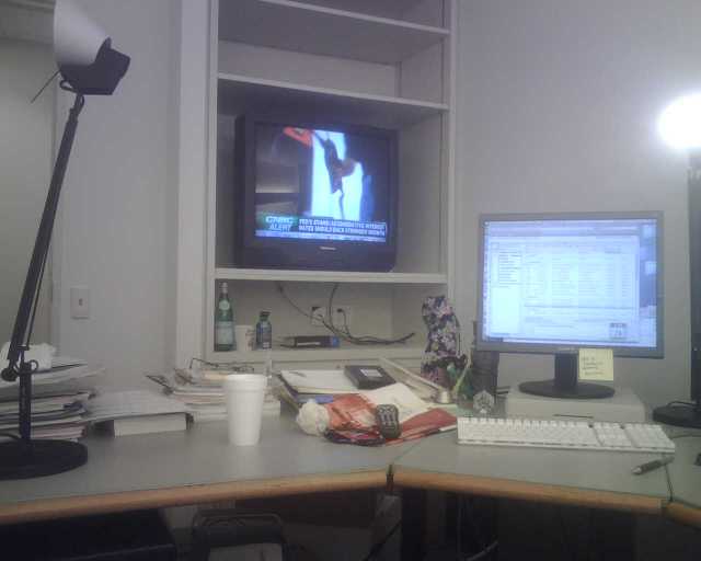 Our newest correspondent — Deirdre’s Terrain — sends in pix of her desk at work, which she labeled only half-ironically as “CUBE Party!” along with the following report: