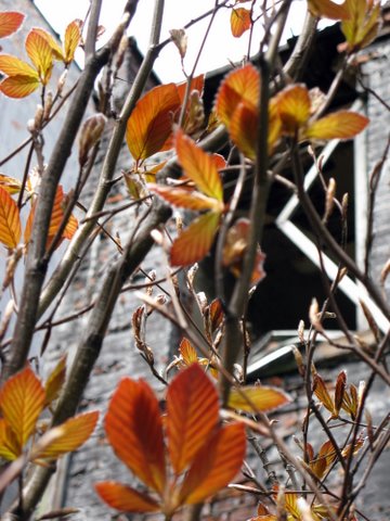 We were waiting a long time for the copper beech (Fagus sylvatica “Dawyck Purple”) to open this spring.